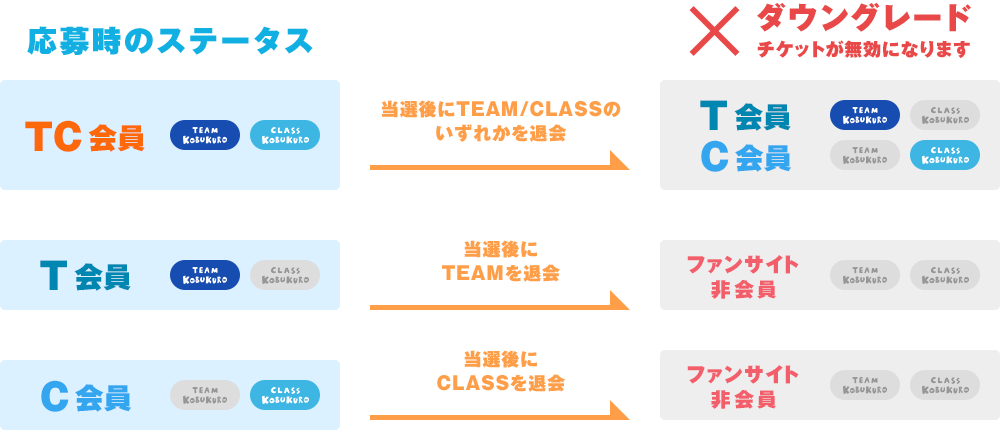 会員先行に当選した「応募者」「同行者」の会員ステータスが、当選公演のトレードが始まる2日前までの間に、1ヶ月以上ダウングレードとなっていた場合、当選チケットが無効になります。